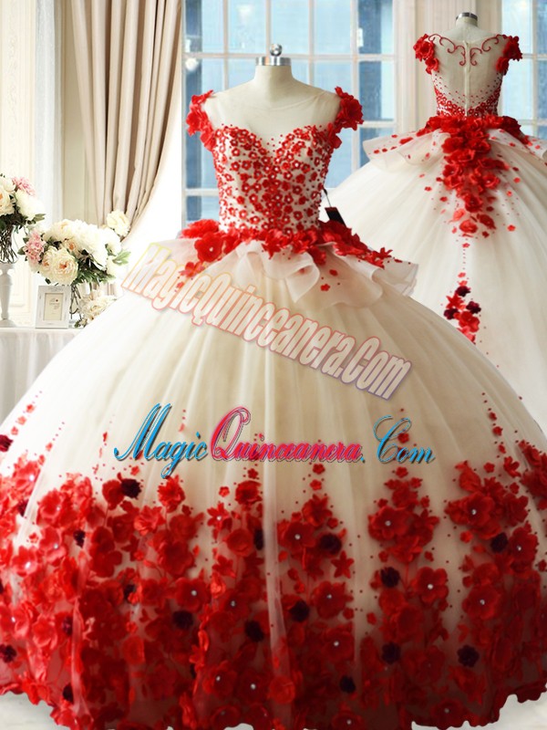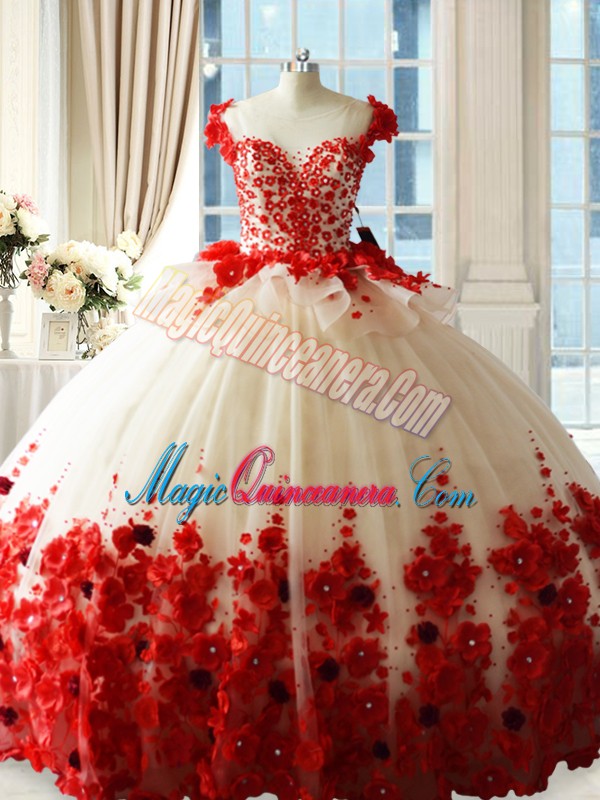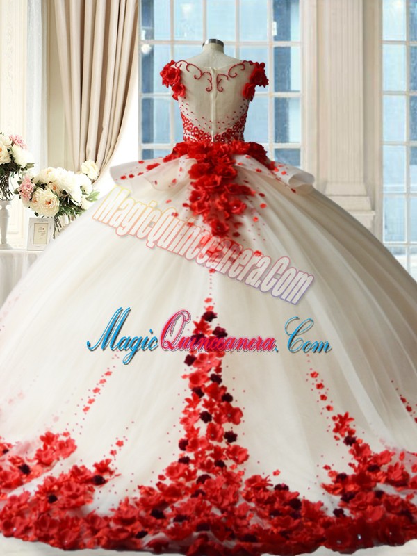 Trendy Red Ball Gowns Tulle Scoop Sleeveless Hand Made Flower Zipper Sweet 16 Dress Brush Train