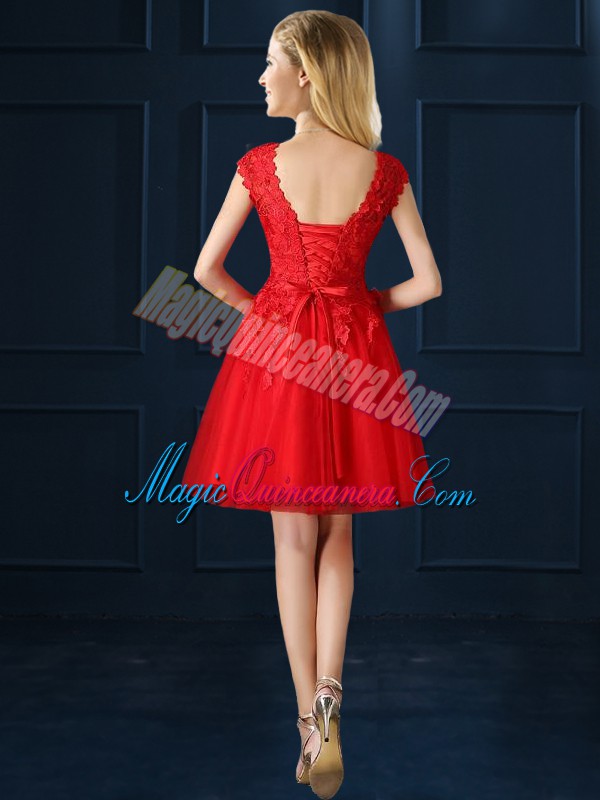 , Tulle Bateau Cap Sleeves Lace Up Lace and Belt Dama Dress in Gold