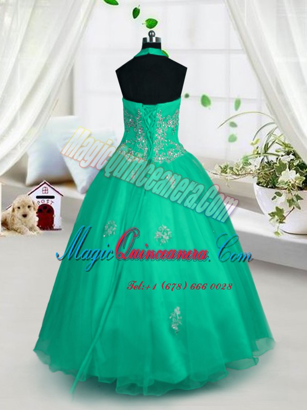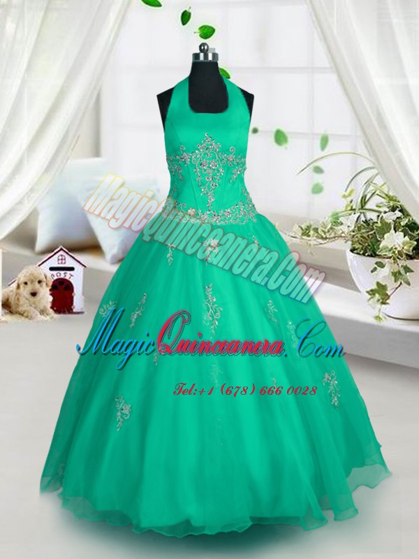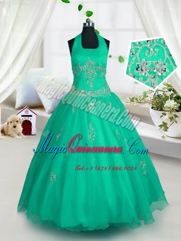 Tulle Halter Top Sleeveless Lace Up Appliques Pageant Dress for Teens in Green