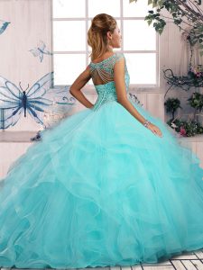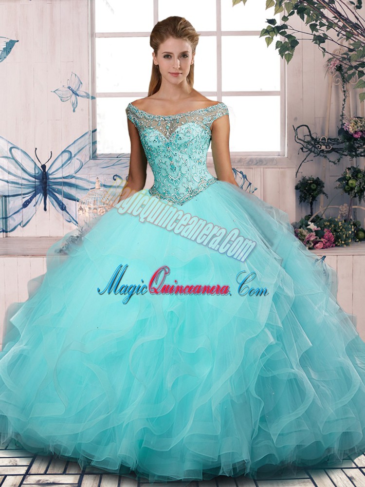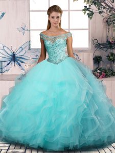 Tulle Off The Shoulder Sleeveless Lace Up Beading and Ruffles Sweet 16 Quinceanera Dress in Aqua Blue