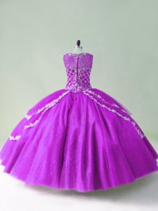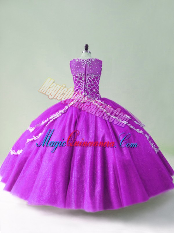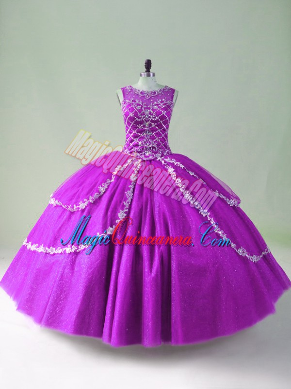, Tulle Scoop Sleeveless Zipper Beading and Appliques Quince Ball Gowns in Purple