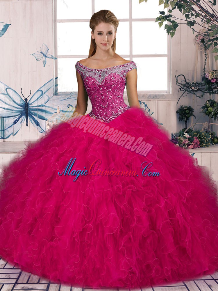 , Tulle Sleeveless Sweet 16 Dresses Brush Train and Beading and Ruffles