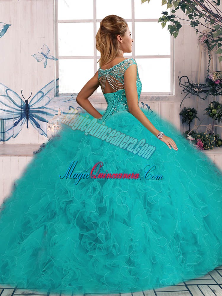 Tulle Sleeveless Sweet 16 Dresses Brush Train and Beading and Ruffles