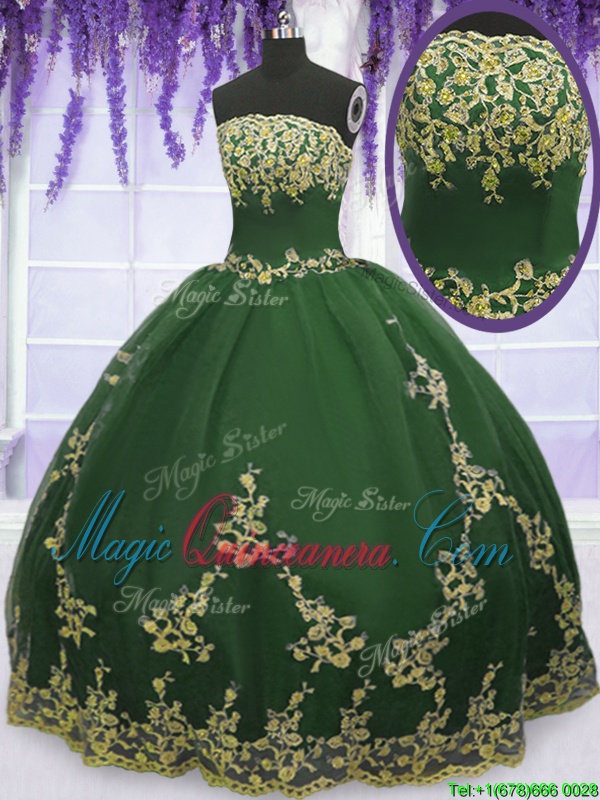 , Tulle Strapless Sleeveless Zipper Appliques Quinceanera Dresses in Dark Green