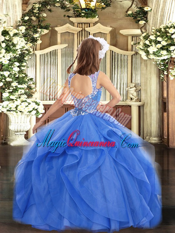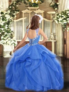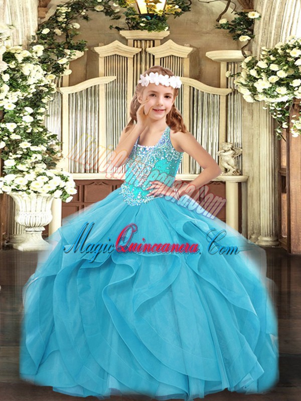 Tulle Straps Sleeveless Lace Up Beading and Ruffles Winning Pageant Gowns in Aqua Blue