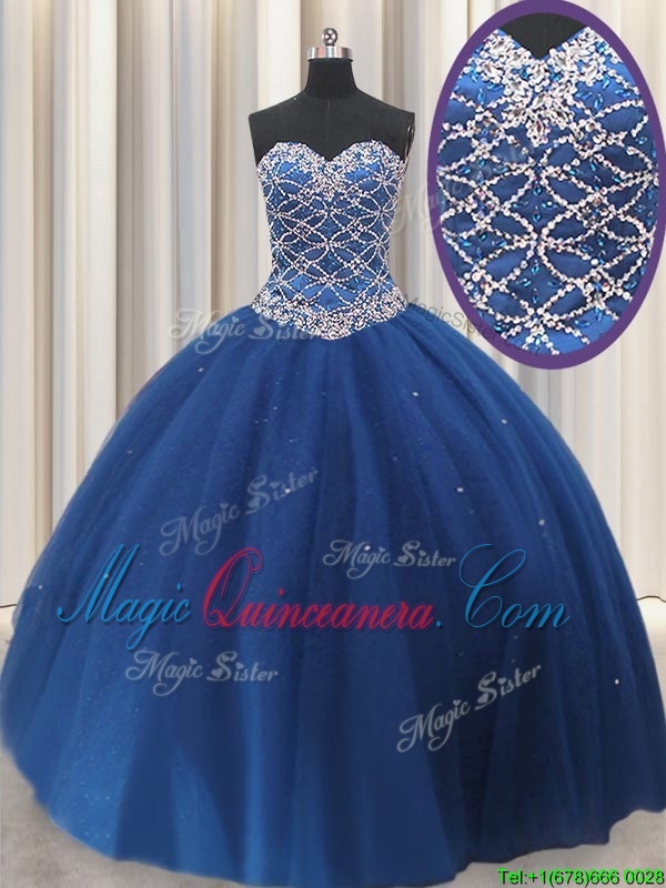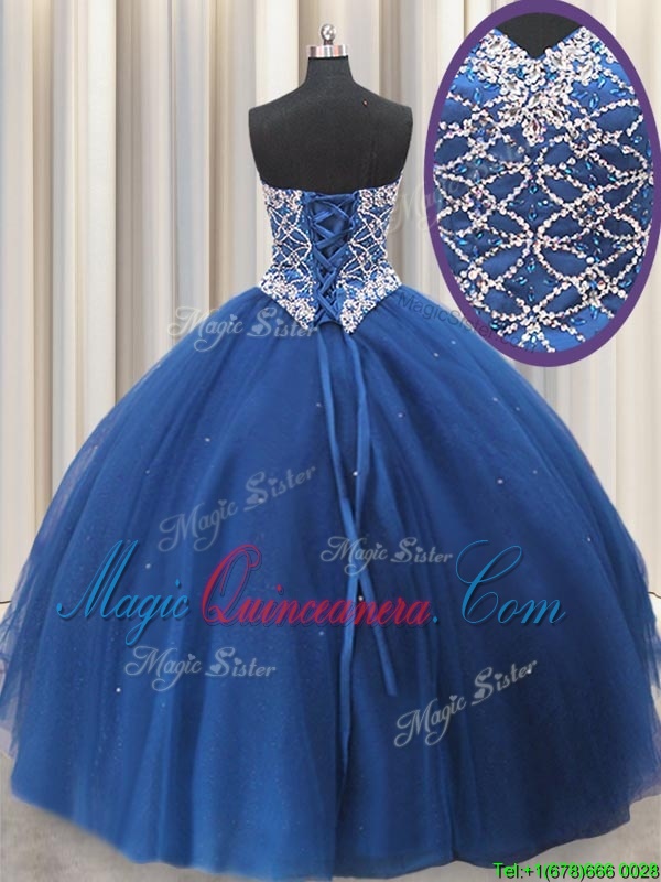 Tulle Sweetheart Sleeveless Lace Up Beading and Sequins Sweet 16 Dresses in Navy Blue