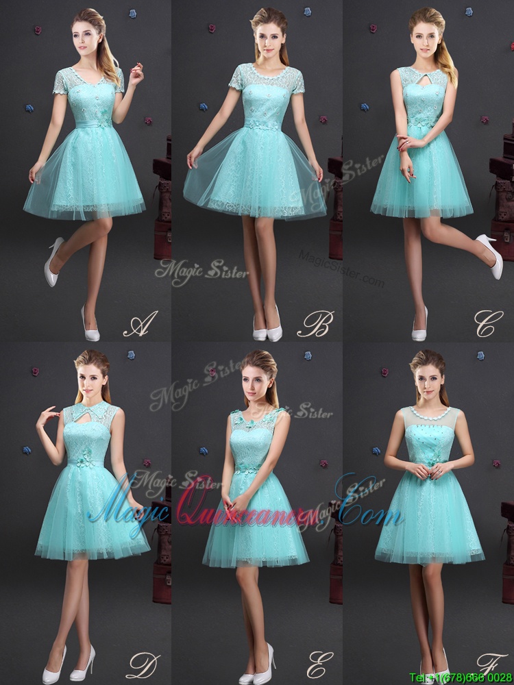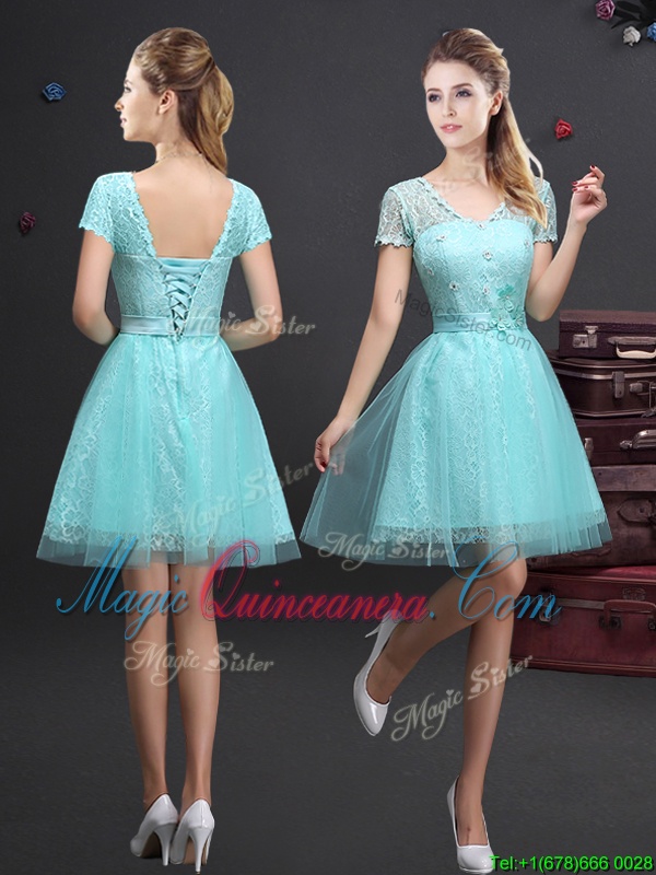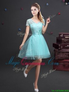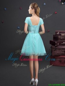 Tulle V-neck Short Sleeves Lace Up Lace and Appliques and Belt Quinceanera Court of Honor Dress in Aqua Blue