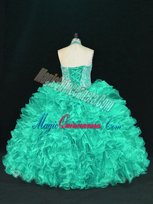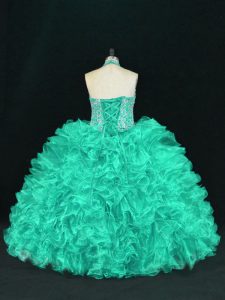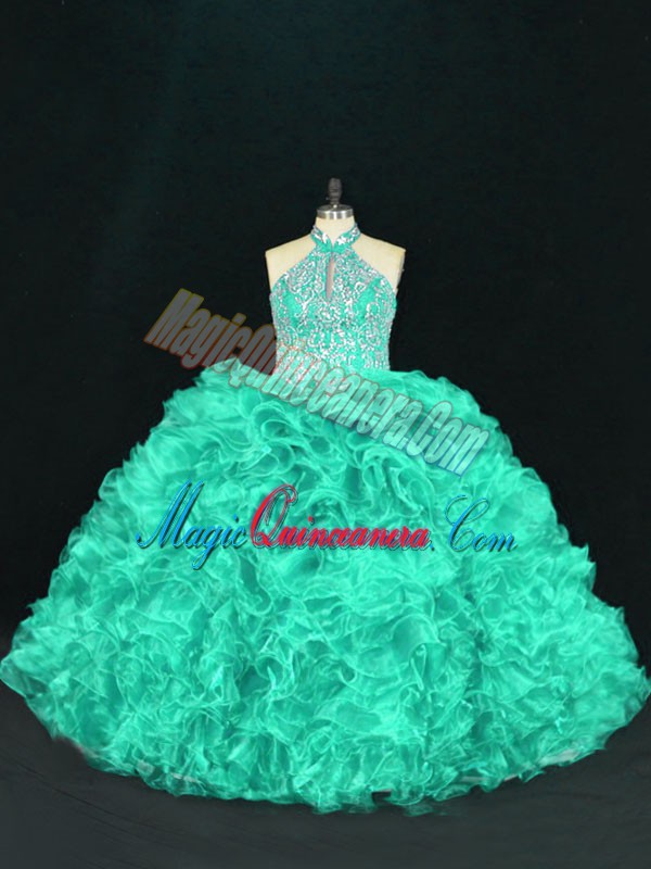 Turquoise 15th Birthday Dress Sweet 16 and Quinceanera with Beading and Ruffles Halter Top Sleeveless Lace Up