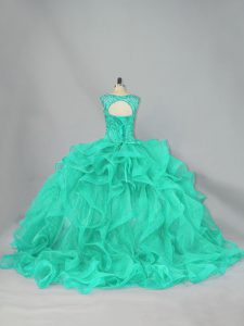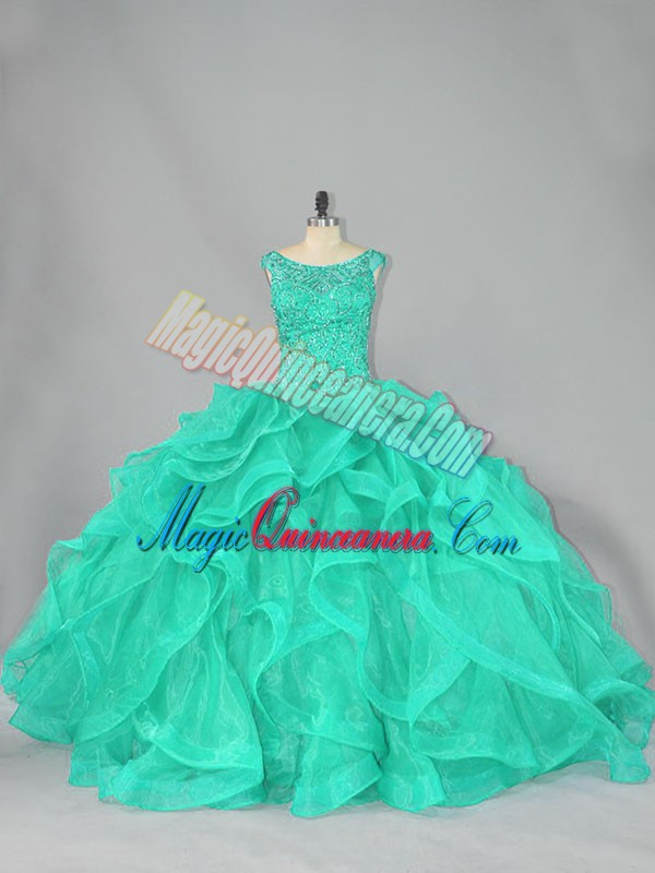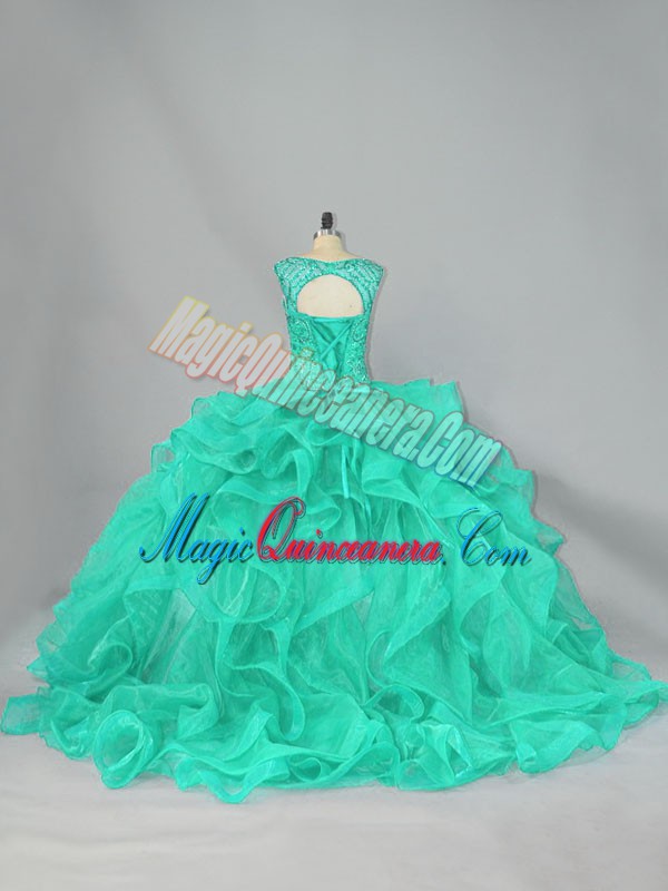 Turquoise Ball Gowns Beading and Ruffles Sweet 16 Dresses Lace Up Organza Sleeveless Floor Length