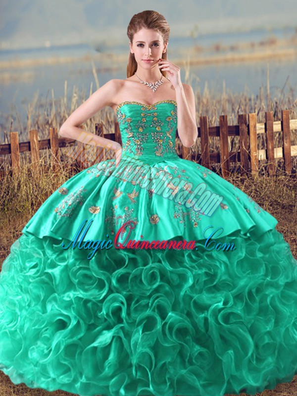 Turquoise Ball Gowns Fabric With Rolling Flowers Sweetheart Sleeveless Embroidery and Ruffles Lace Up Ball Gown Prom Dress Brush Train