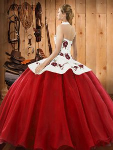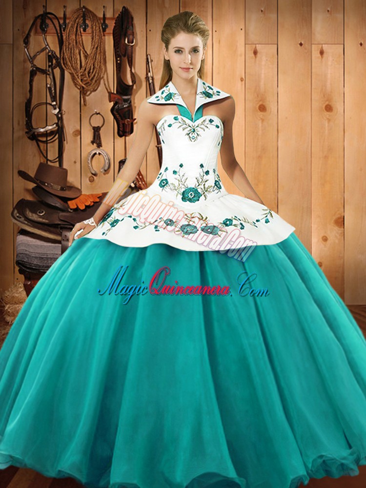 Turquoise Ball Gowns Halter Top Sleeveless Satin and Tulle Floor Length Lace Up Embroidery 15th Birthday Dress