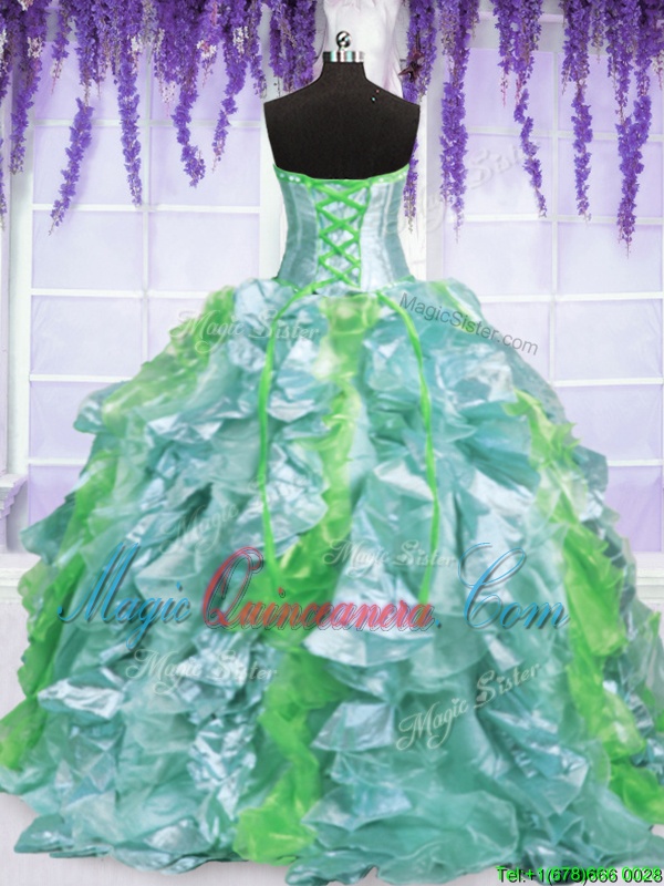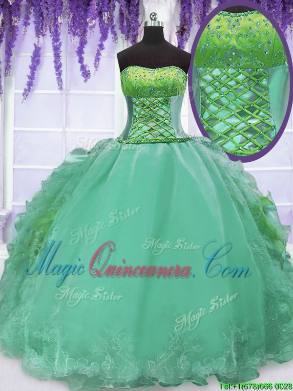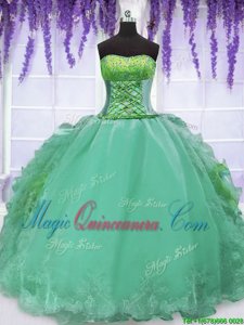 Turquoise Ball Gowns Strapless Sleeveless Organza Floor Length Lace Up Embroidery and Ruffles 15 Quinceanera Dress