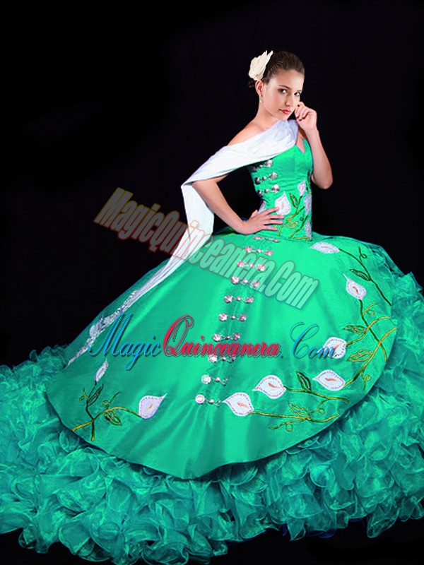Turquoise Sleeveless Embroidery and Ruffles Lace Up Quinceanera Gown
