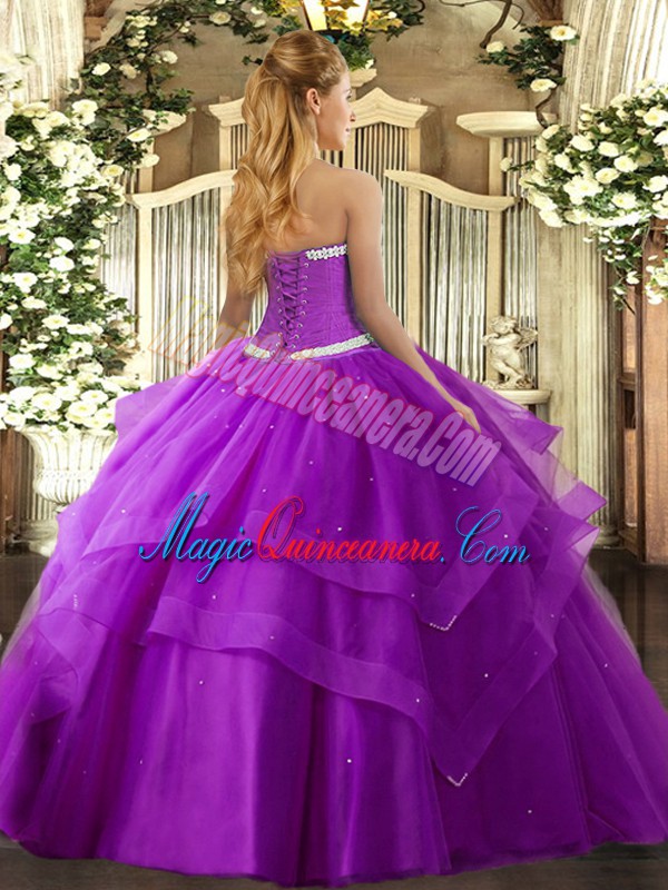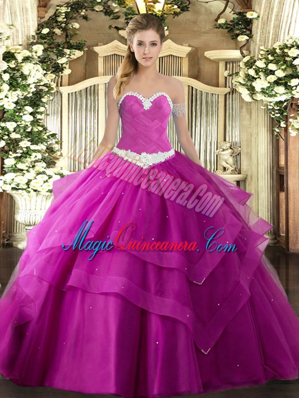 Unique Floor Length Fuchsia Quinceanera Gown Tulle Sleeveless Appliques and Ruffled Layers