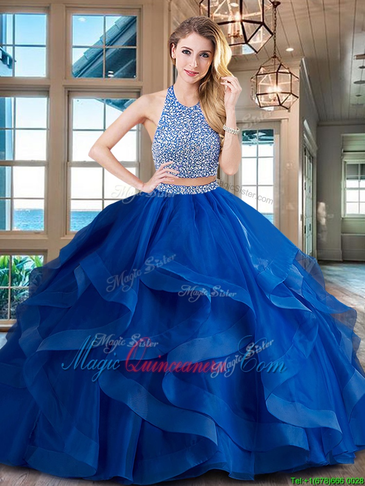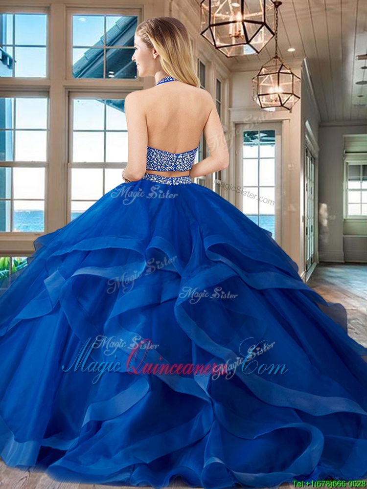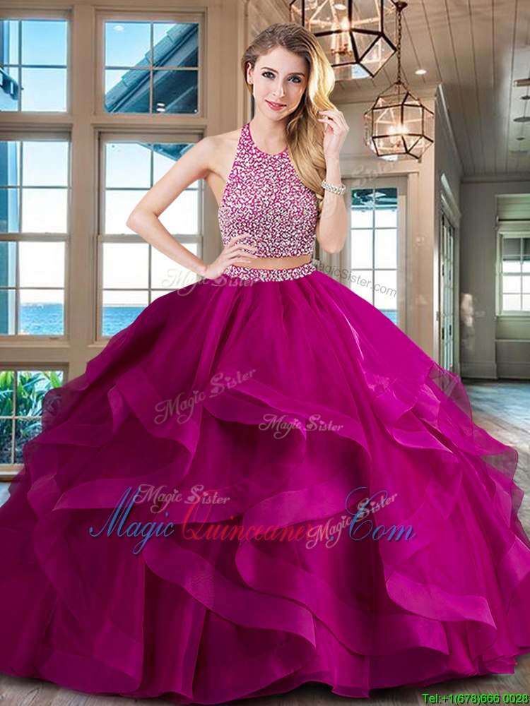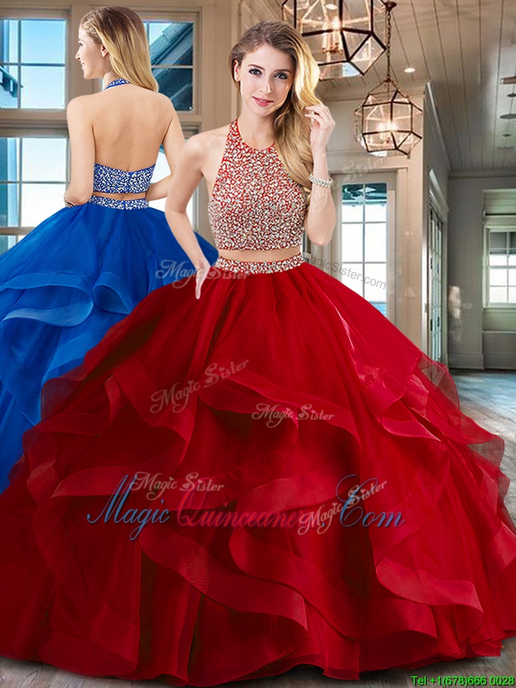 Unique Halter Top Red Two Pieces Beading and Ruffles Sweet 16 Quinceanera Dress Backless Tulle Sleeveless With Train