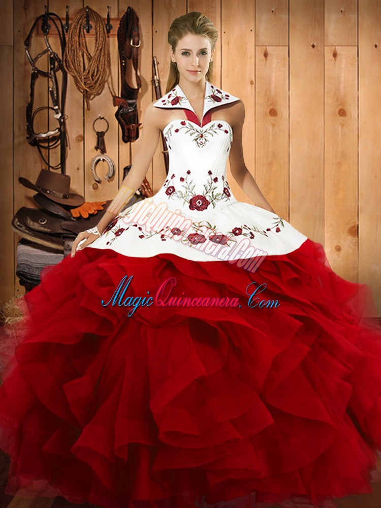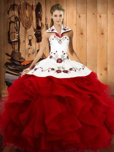 , Unique Halter Top Sleeveless Lace Up Sweet 16 Dresses Wine Red Tulle