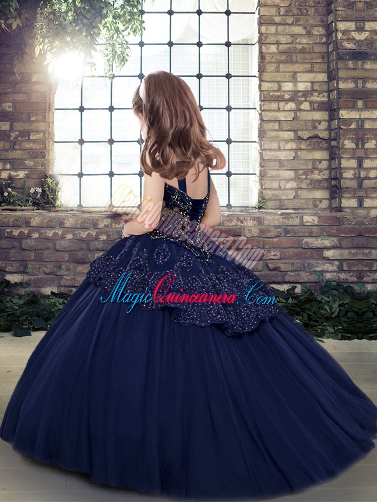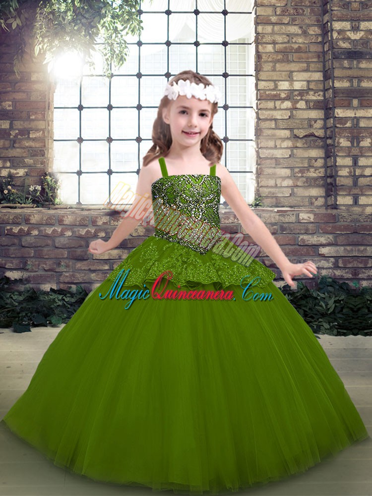 Unique Olive Green Tulle Lace Up Little Girl Pageant Dress Sleeveless Floor Length Beading
