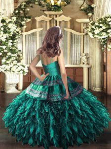 Unique Sleeveless Floor Length Appliques and Ruffles Zipper Custom Made Pageant Dress with Turquoise