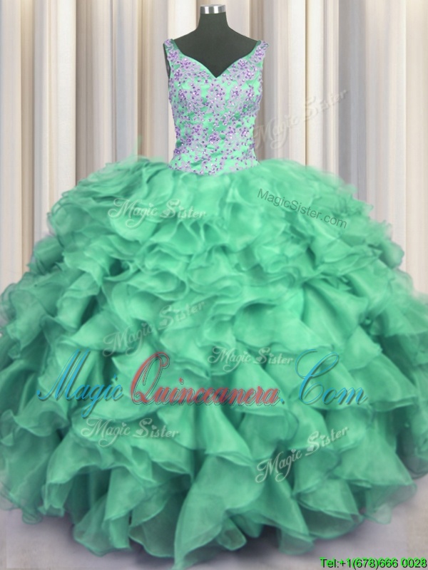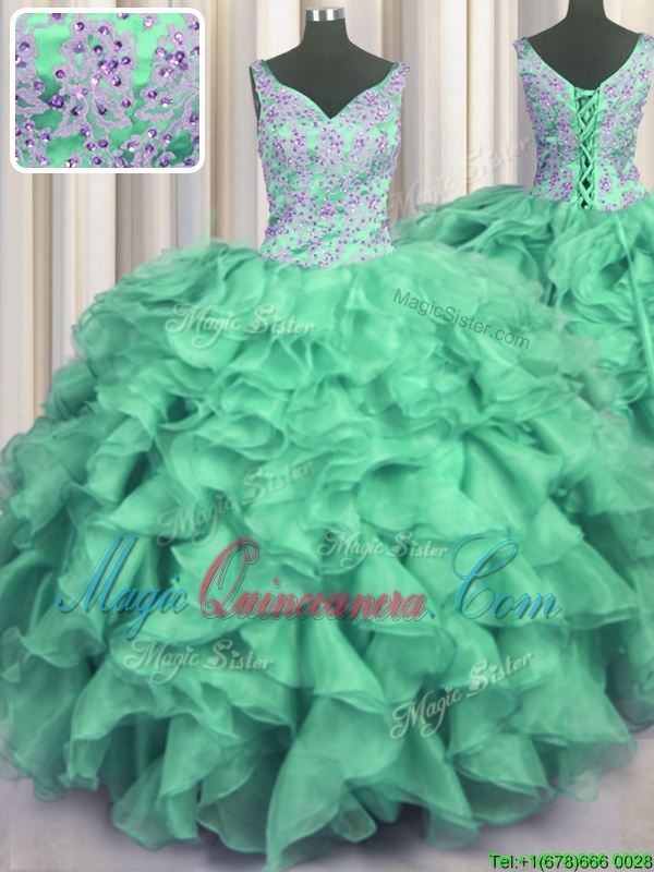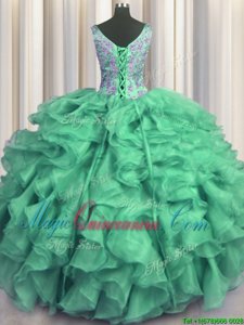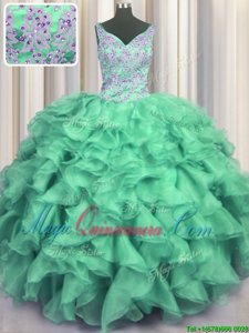 V Neck Floor Length Turquoise 15 Quinceanera Dress Organza Sleeveless Beading and Ruffles