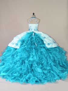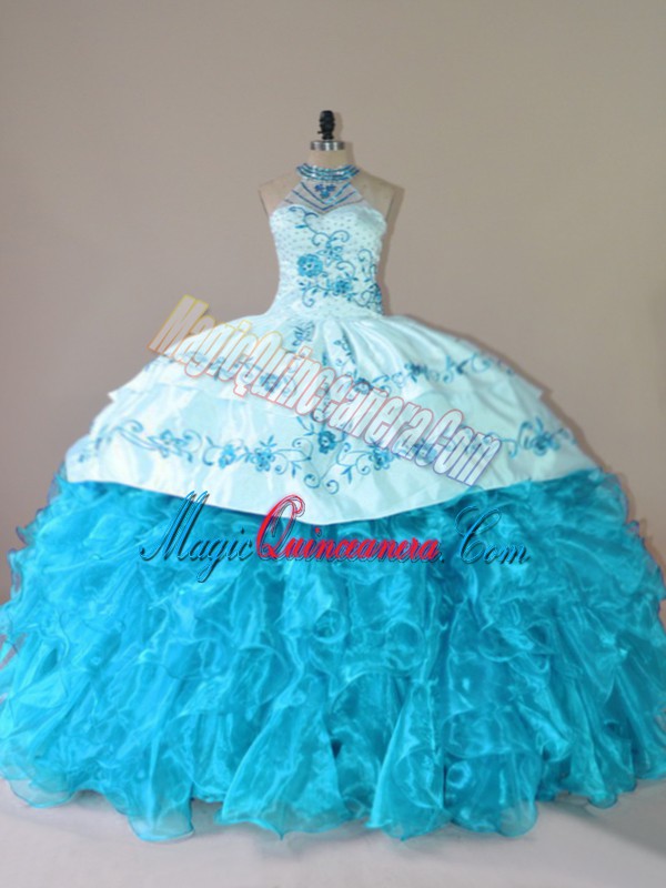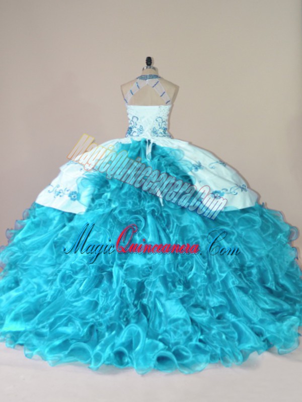 Vintage Aqua Blue Halter Top Lace Up Embroidery and Ruffles Quinceanera Gown Court Train Sleeveless