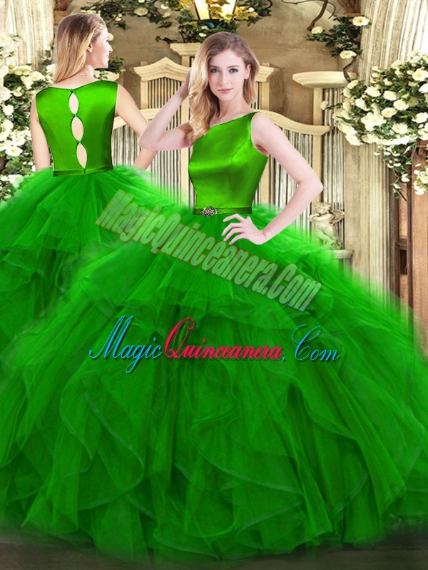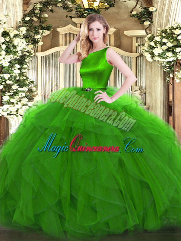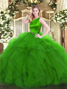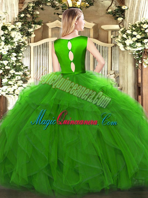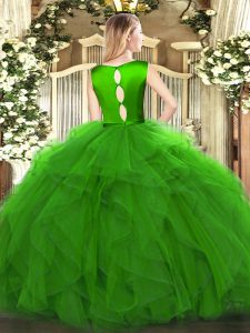 Vintage Green Ball Gowns Scoop Sleeveless Organza Floor Length Clasp Handle Ruffles Quinceanera Gowns