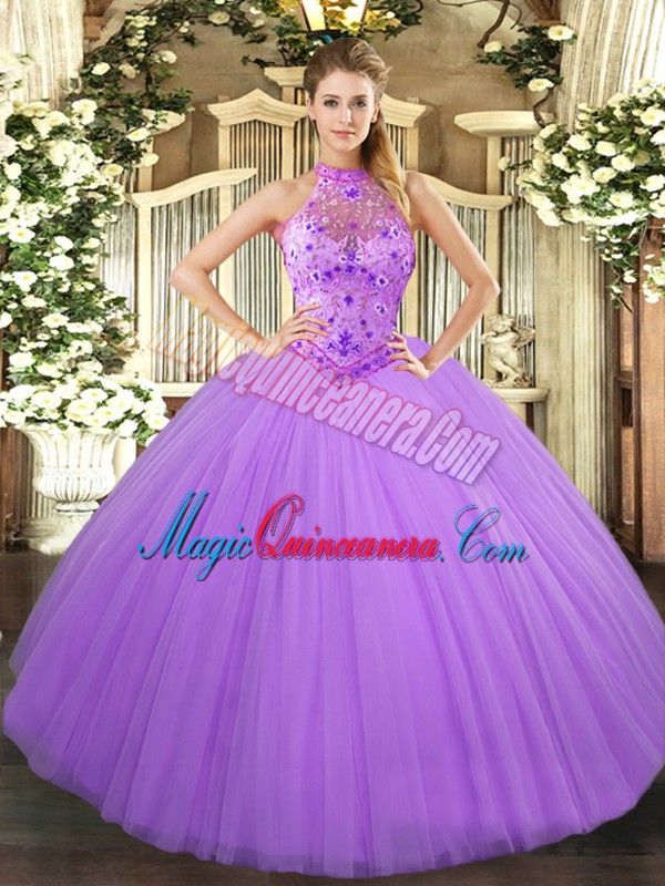 Vintage Lavender Lace Up Halter Top Beading and Embroidery Quinceanera Gown Tulle Sleeveless