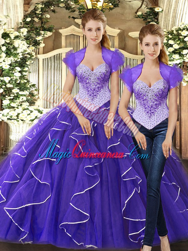 Vintage Purple Sleeveless Tulle Lace Up Quinceanera Gown for Military Ball and Sweet 16 and Quinceanera