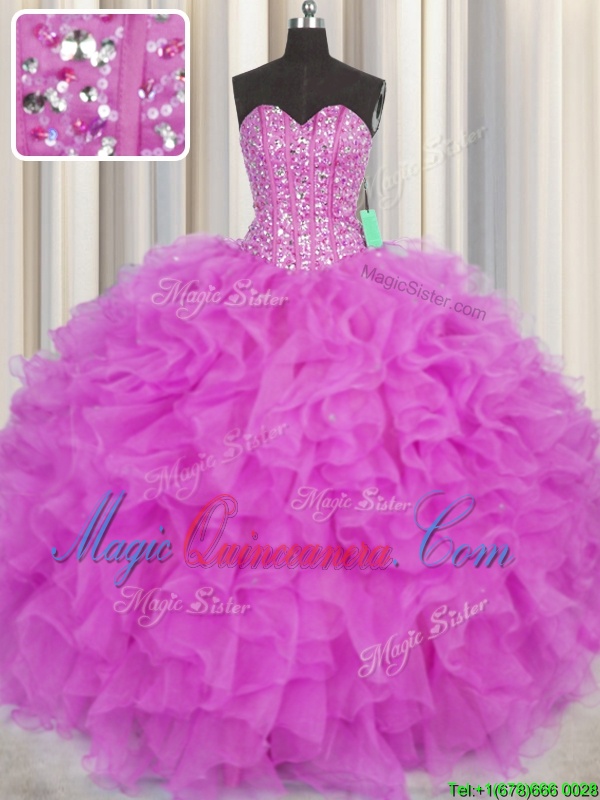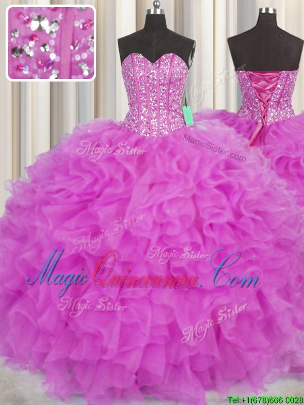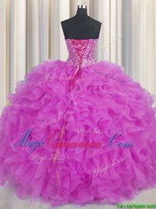 Vintage Visible Boning Hot Pink and Fuchsia Organza Lace Up 15th Birthday Dress Sleeveless Floor Length Beading and Ruffles