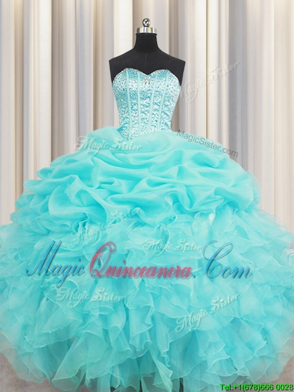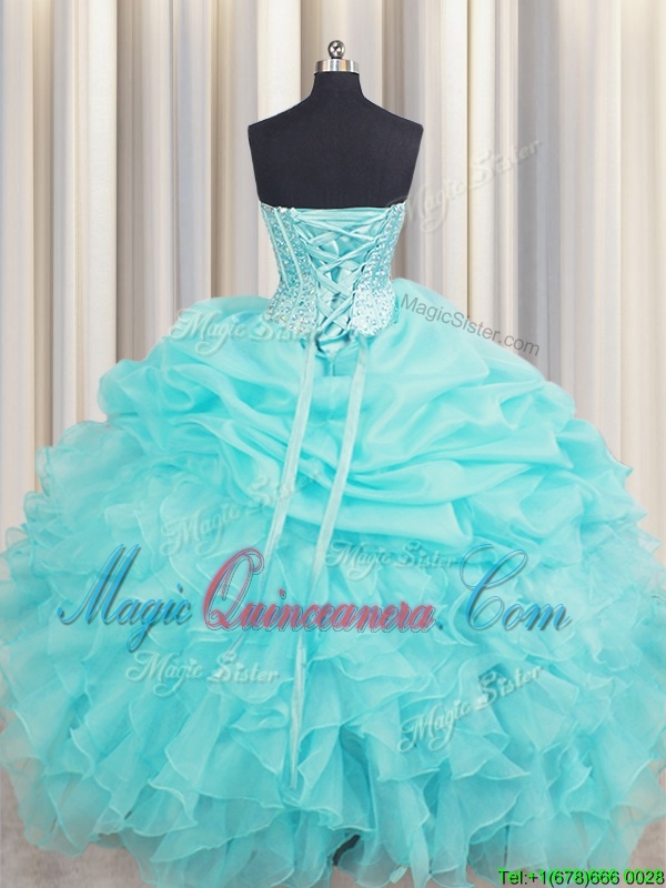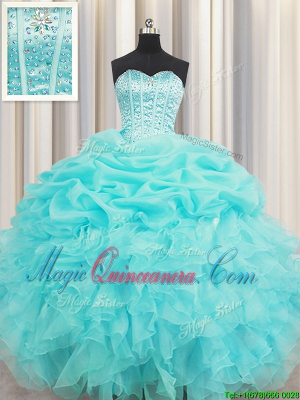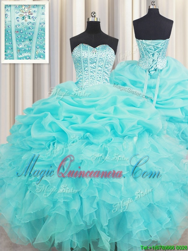 Visible Boning Baby Blue Lace Up Sweetheart Beading and Ruffles and Pick Ups Quinceanera Dress Organza Sleeveless