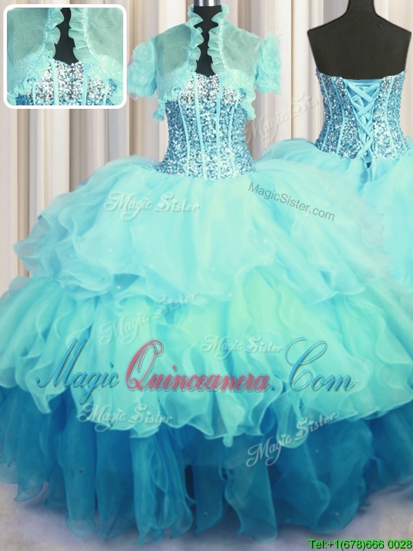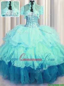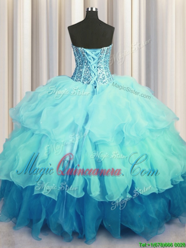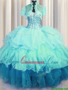 Visible Boning Bling-bling Aqua Blue Sleeveless Organza Lace Up Quinceanera Dress for Military Ball and Sweet 16 and Quinceanera