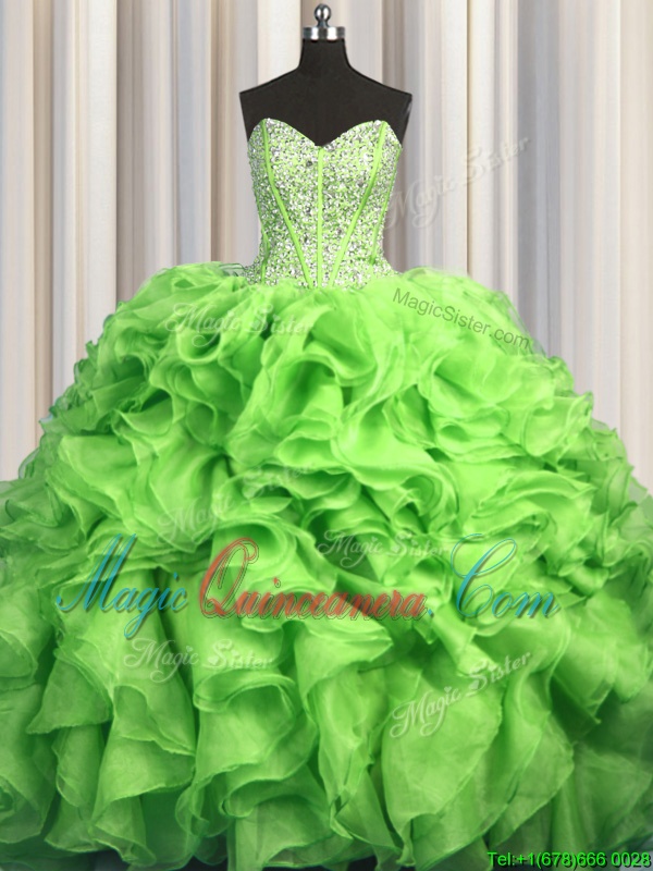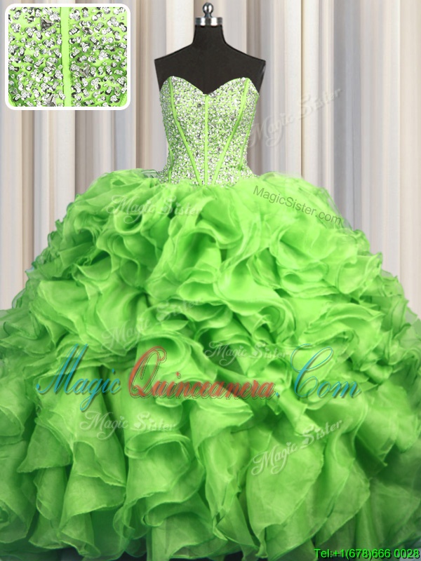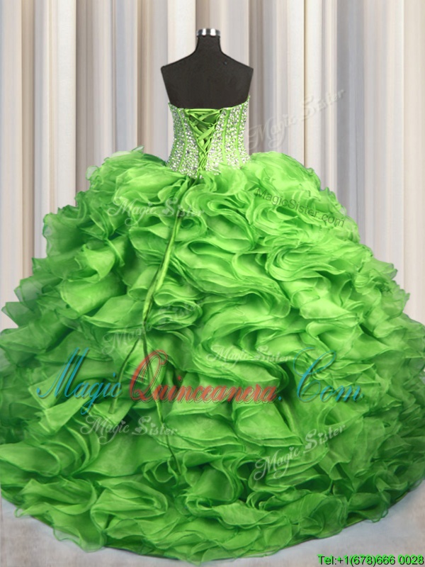 Visible Boning Brush Train Sleeveless With Train Beading and Ruffles Lace Up Sweet 16 Dresses with Yellow Green Sweep Train
