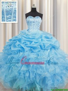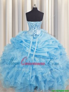 , Visible Boning Floor Length Lace Up Vestidos de Quinceanera Baby Blue and In for Military Ball and Sweet 16 and Quinceanera with Beading and Ruffles and Pick Ups