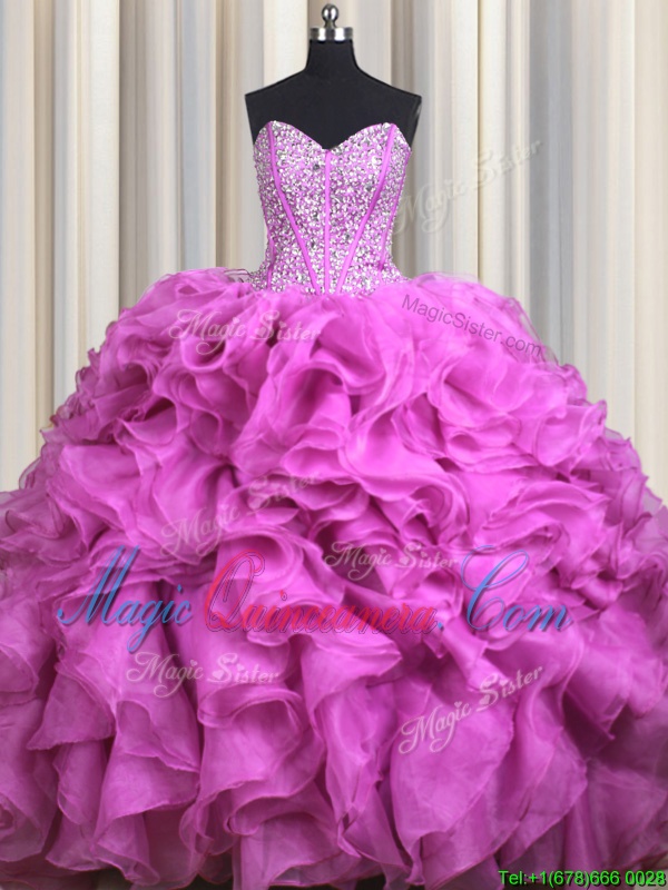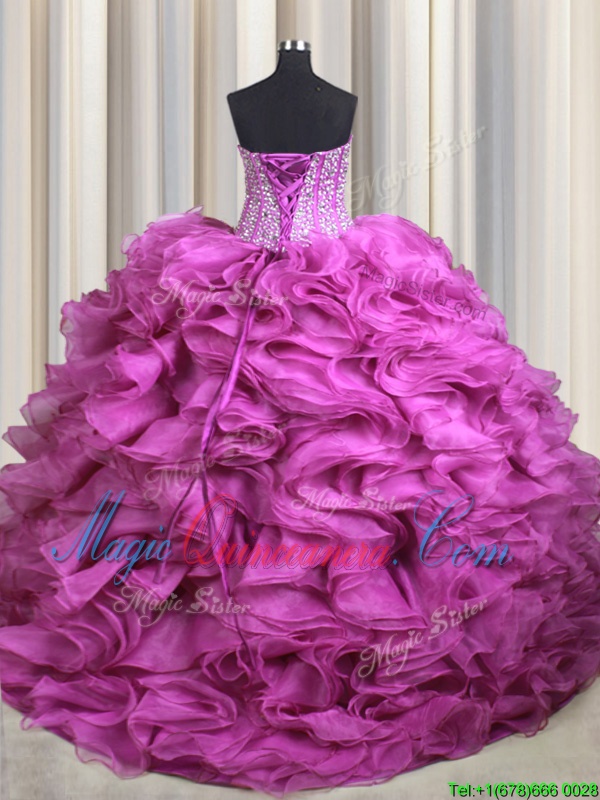 Visible Boning Organza Sleeveless With Train Quinceanera Dresses Brush Train and Beading and Ruffles