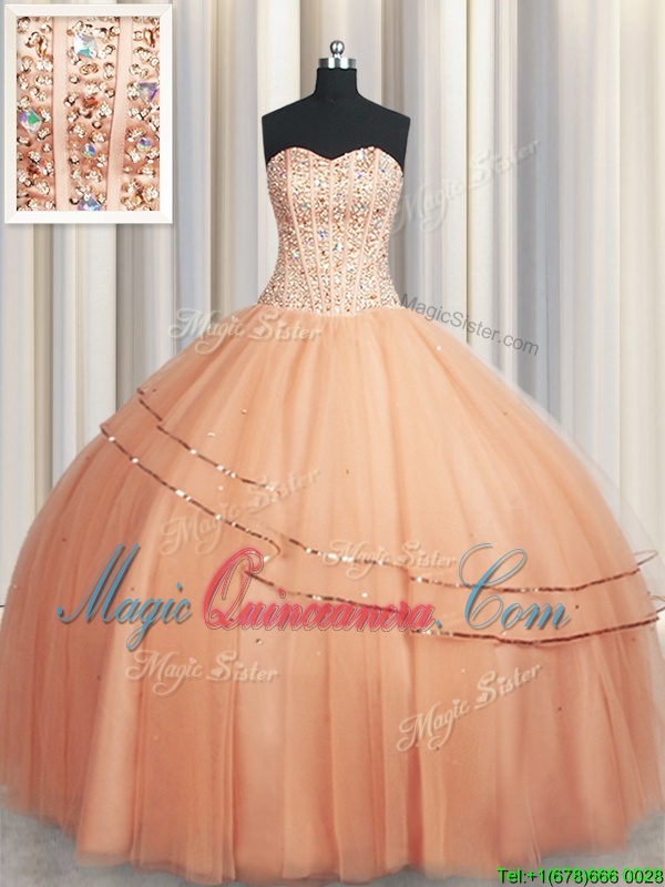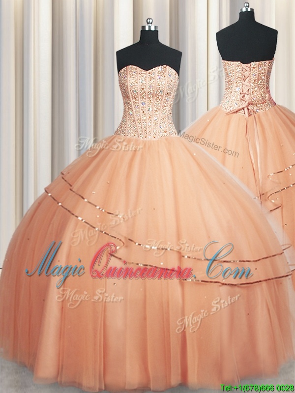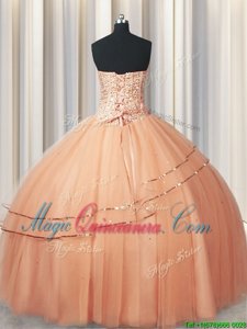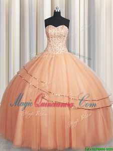 Visible Boning Really Puffy Peach Sleeveless Organza Lace Up Vestidos de Quinceanera for Military Ball and Sweet 16 and Quinceanera