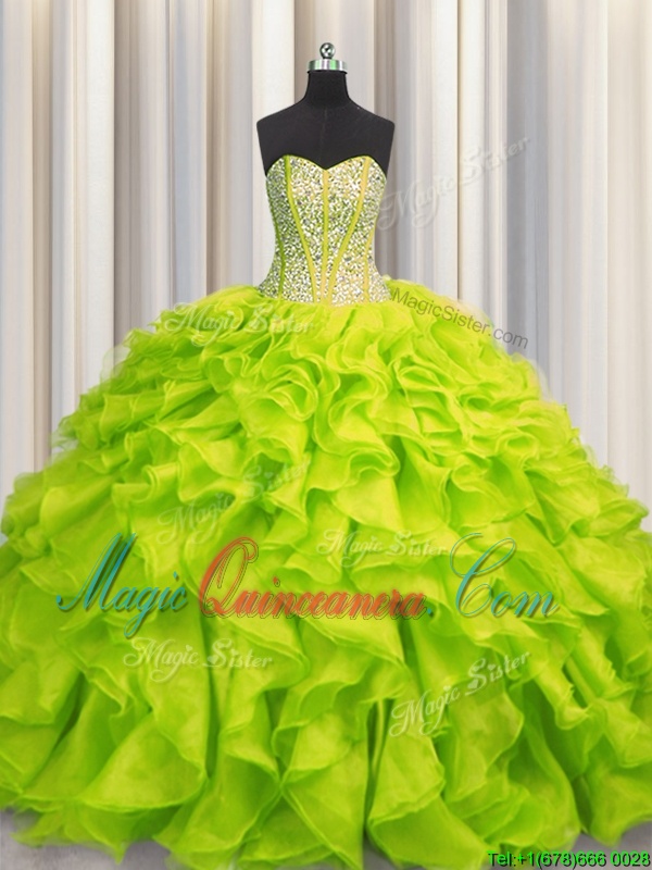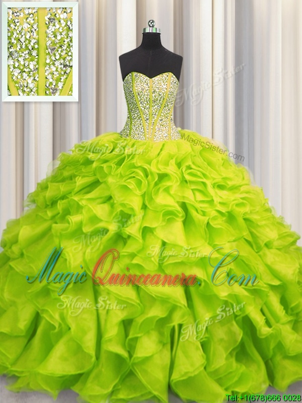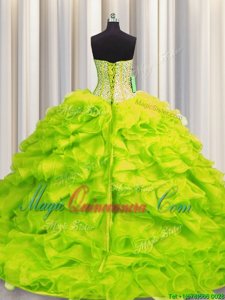Visible Boning Yellow Green Lace Up Sweetheart Beading and Ruffles 15th Birthday Dress Organza Sleeveless
