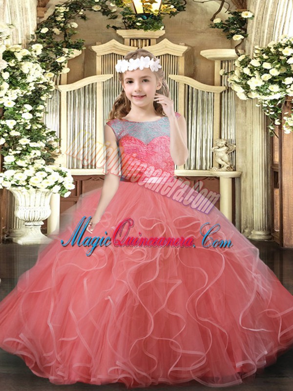 Watermelon Red Ball Gowns Scoop Sleeveless Tulle Floor Length Backless Lace and Ruffles Kids Pageant Dress
