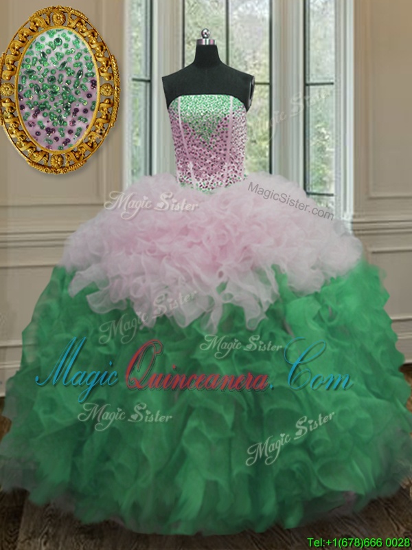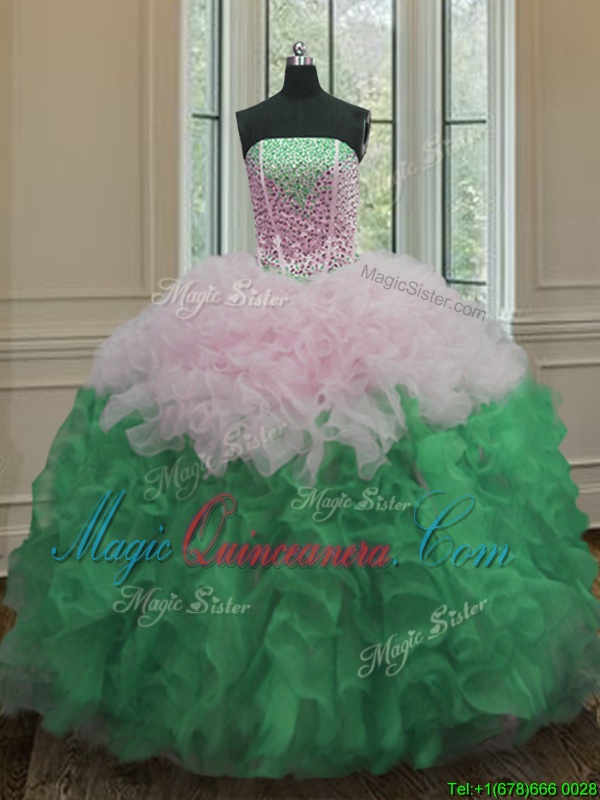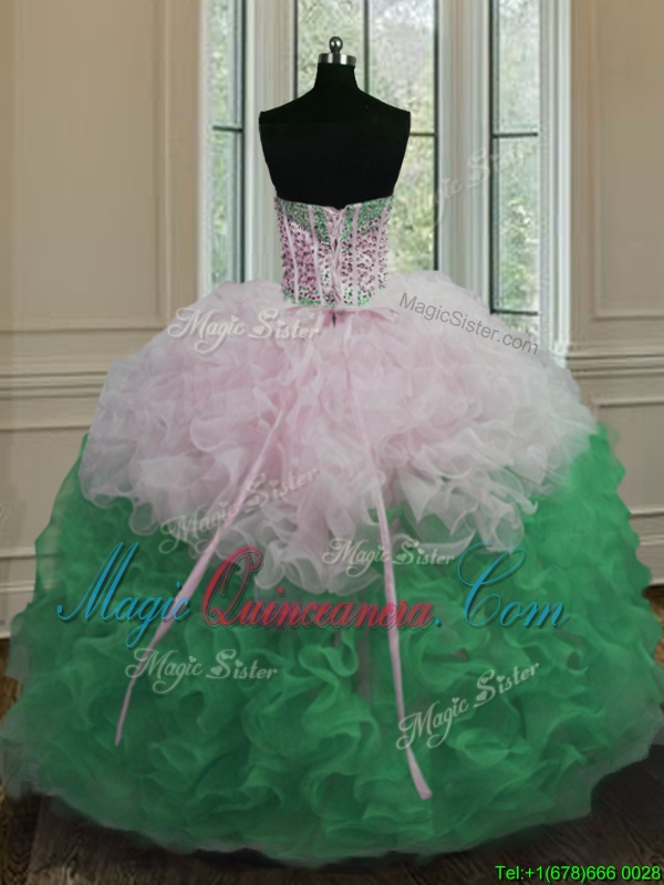 , White and Green Sleeveless Beading and Ruffles Floor Length Quince Ball Gowns