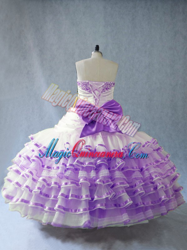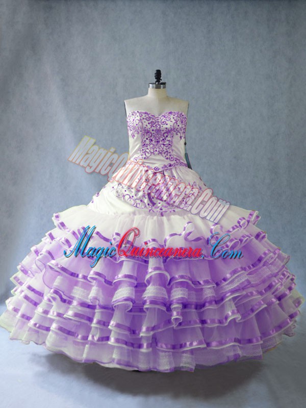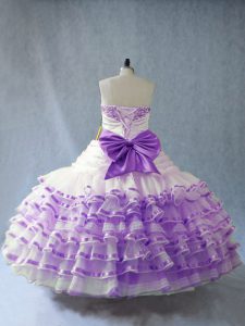 White And Purple Lace Up 15 Quinceanera Dress Embroidery and Ruffled Layers and Bowknot Sleeveless Floor Length
