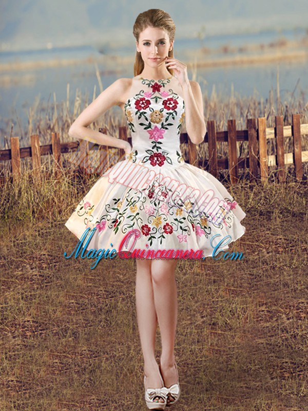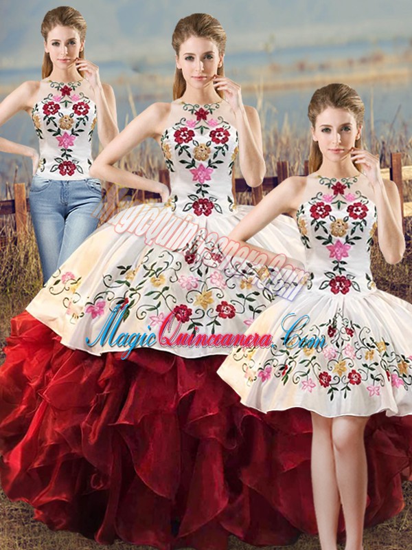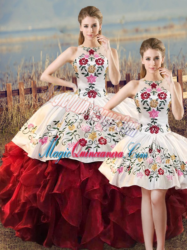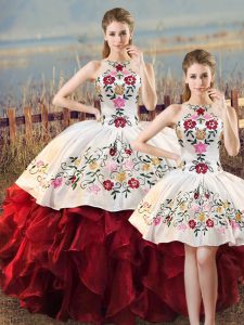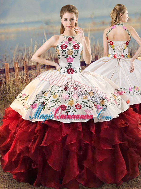 White And Red Lace Up Halter Top Embroidery and Ruffles Ball Gown Prom Dress Organza Sleeveless