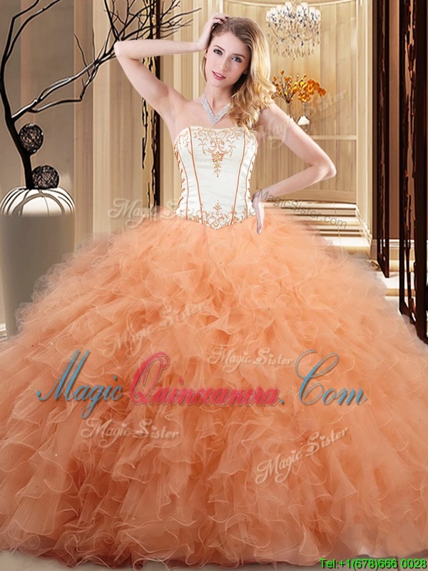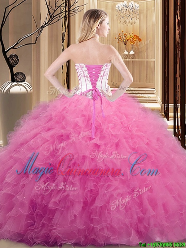 White and Rose Pink and Orange Strapless Neckline Embroidery and Ruffled Layers Quinceanera Gown Sleeveless Lace Up