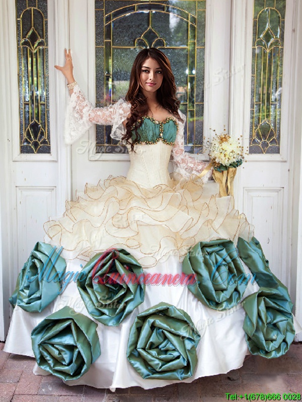 White Ball Gowns Sweetheart Sleeveless Organza and Taffeta Floor Length Lace Up Beading and Ruffles and Hand Made Flower 15th Birthday Dress