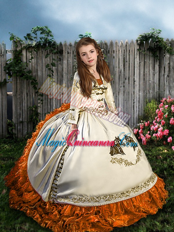 , White Sleeveless Sweep Train Embroidery and Ruffles Girls Pageant Dresses