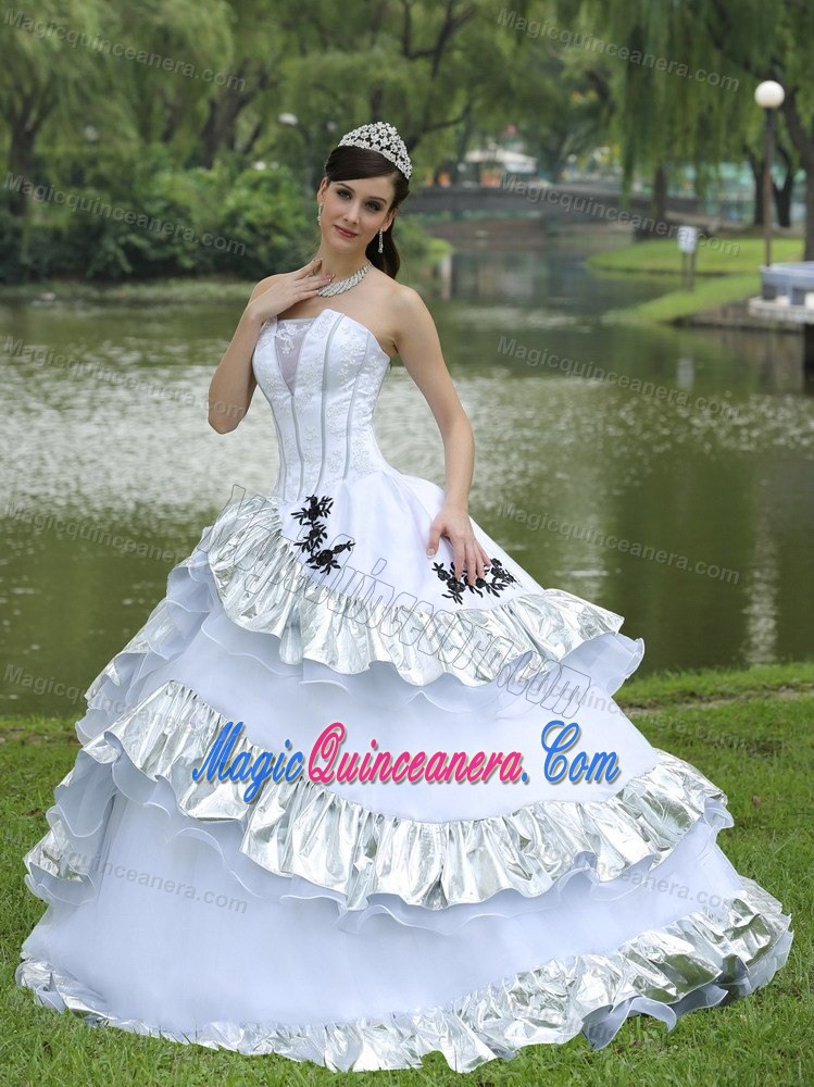 White Strapless Quinceanera Dresses with Appliques and Flouncing