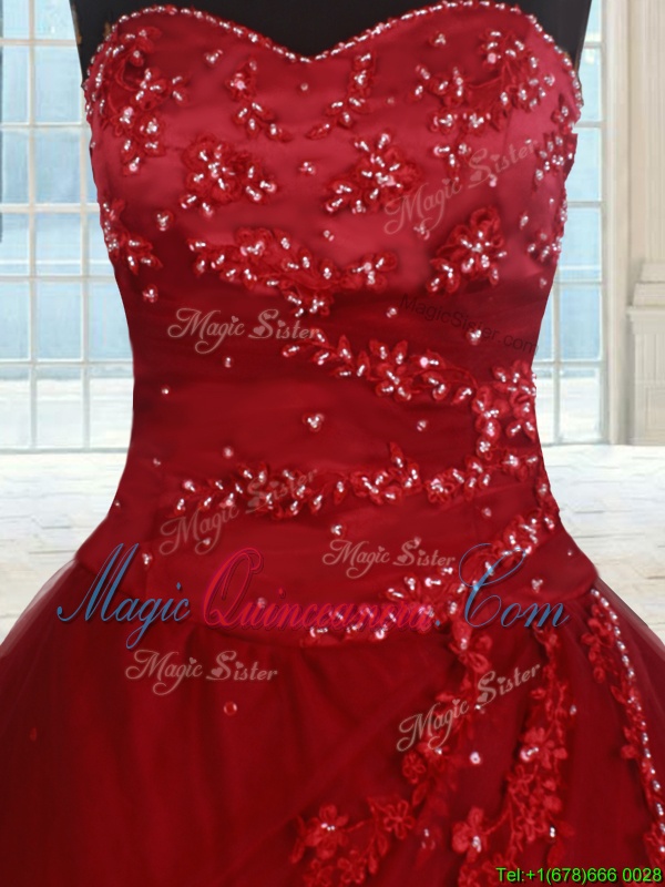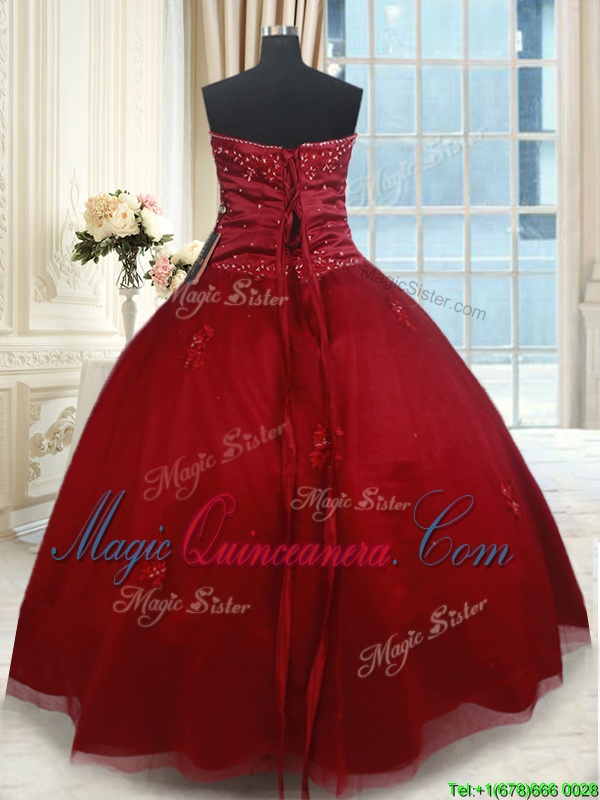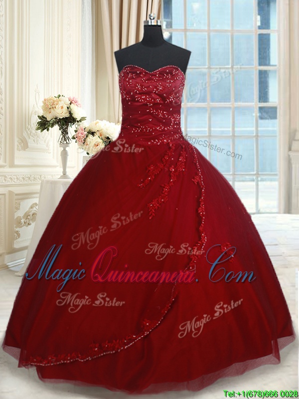 Wine Red Ball Gowns Sweetheart Sleeveless Tulle Floor Length Lace Up Beading and Appliques Sweet 16 Dresses