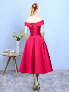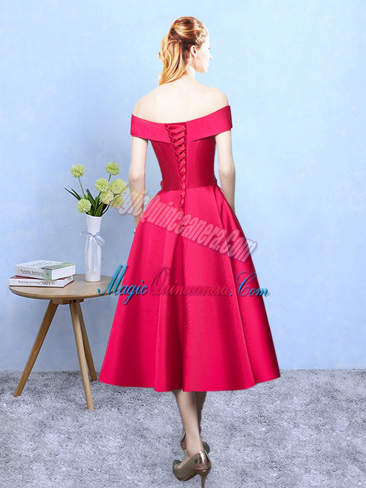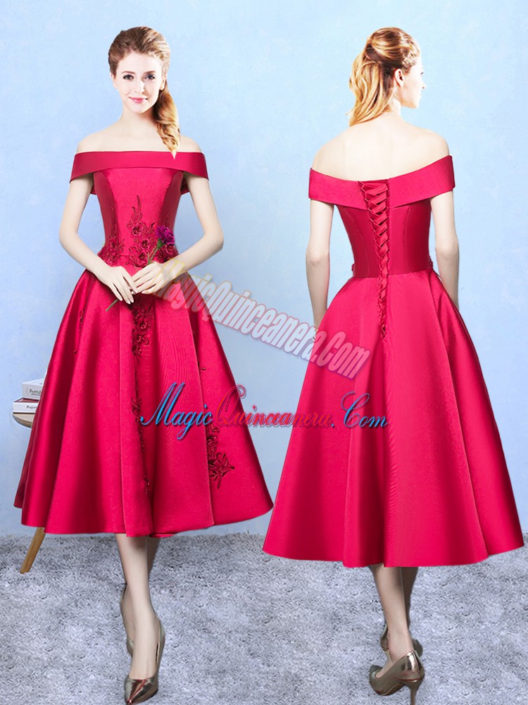 Wine Red Cap Sleeves Appliques Tea Length Vestidos de Damas