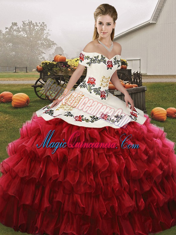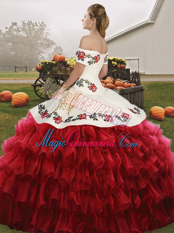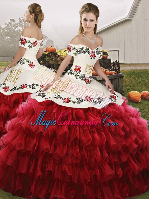 Wine Red Lace Up Off The Shoulder Embroidery and Ruffled Layers Ball Gown Prom Dress Organza Sleeveless