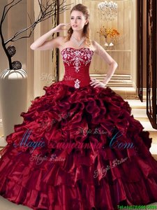 Wine Red Organza Lace Up Vestidos de Quinceanera Sleeveless Floor Length Embroidery and Ruffles