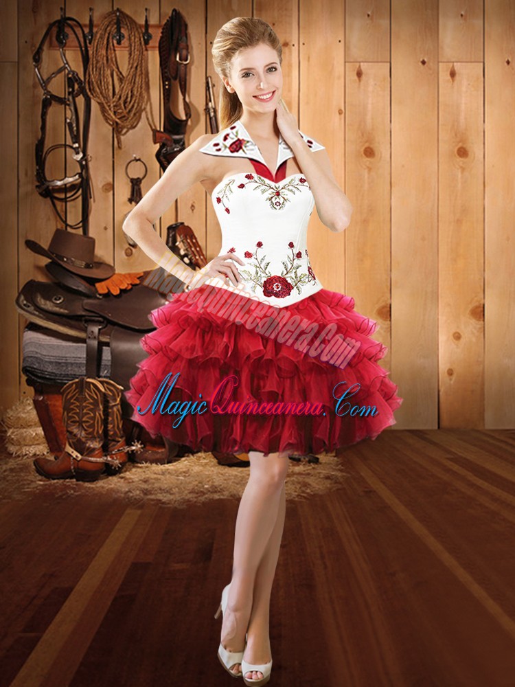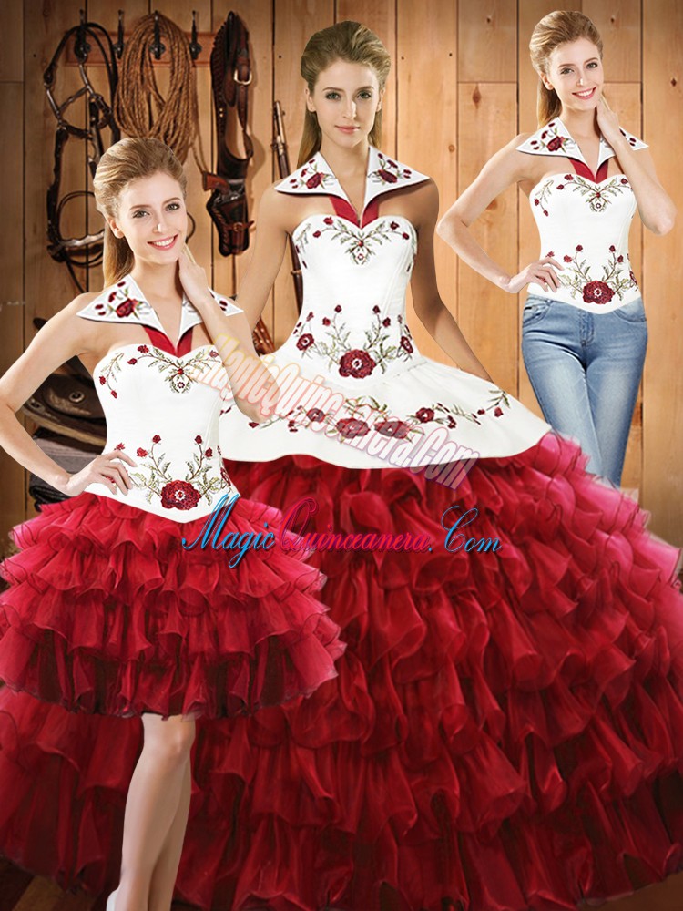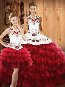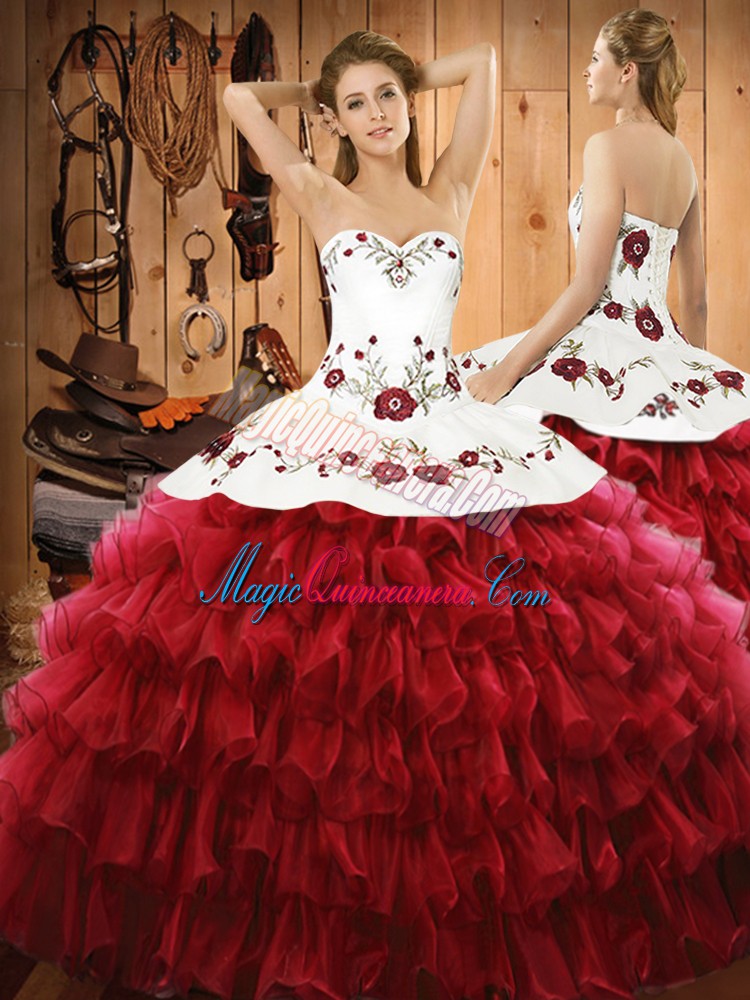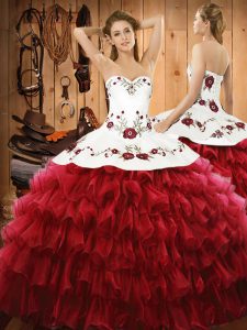 Wine Red Sleeveless Floor Length Embroidery and Ruffled Layers Lace Up Quinceanera Dresses