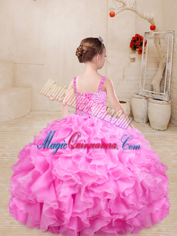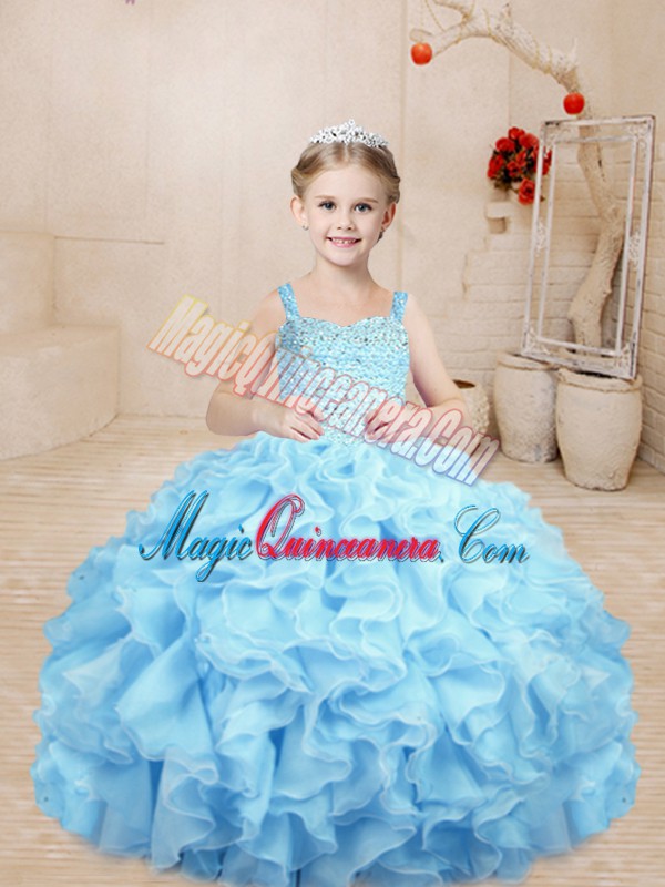 Wonderful Floor Length Lace Up Little Girls Pageant Dress Wholesale Baby Blue for Sweet 16 and Quinceanera with Beading and Ruffles