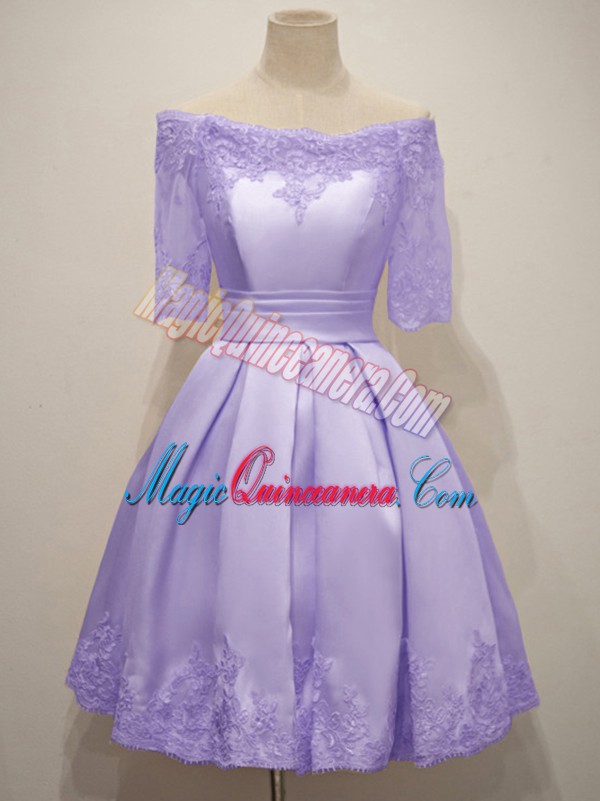 Wonderful Knee Length Lace Up Damas Dress Lavender for Prom and Party and Wedding Party with Lace